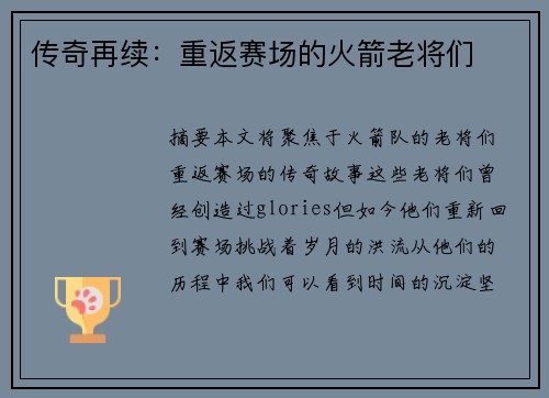 本文将聚焦于火箭队的老将们重返赛场的传奇故事。这些老将们曾经创造过 glories,但如今他们重新回到赛场,挑战着岁月的洪流。从他们的历程中我们可以看到时间的沉淀,坚韧不拔的精神,以及对篮球事业的不懈追求。他们的故事激励着我们,让我们相信无论年龄如何,梦想永不老去。